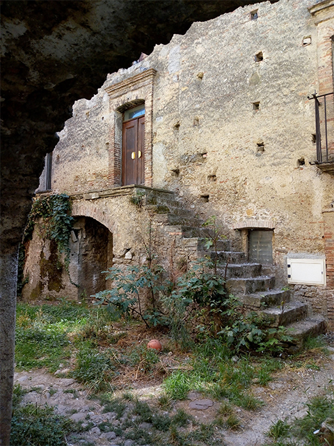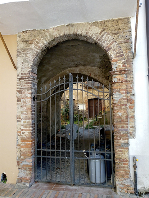 Durch den mit Pfeilern aus Ziegelsteinen ausgestatteten Rundbogen am Eingang gelangt man durch einen Raum mit niedrigem, unregelmäßig geformtem Gewölbe (ebenfalls aus Ziegelsteinen) in den Innenhof, den sich mehrere Häuser teilen und der von schönen Außentreppen gekennzeichnet ist.