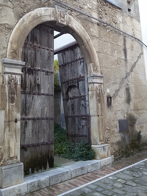 Durch das Portal gelangt man in den Innenhof mit einer breiten Treppe, die sich auf halbem Weg zweiteilt und nach rechts und links führt. Im Hof stehen zwei Pfeiler, die einst vielleicht als Träger für eine abnehmbare, saisonbedingte Bedachung dienten.